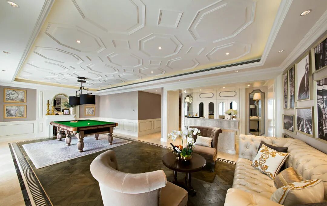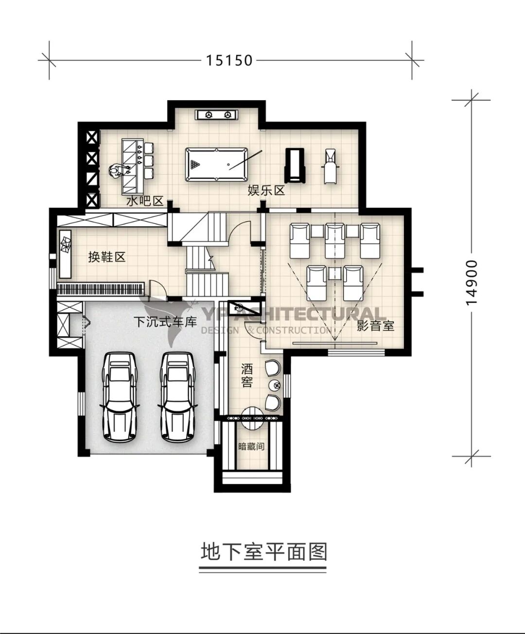 在地下室开辟出娱乐室、水吧、影音室、下沉式车库,真正做到动静分区,既能保证年轻人的打台球、看电影、品酒交友等娱乐活动,又不影响父母喜静需求。
