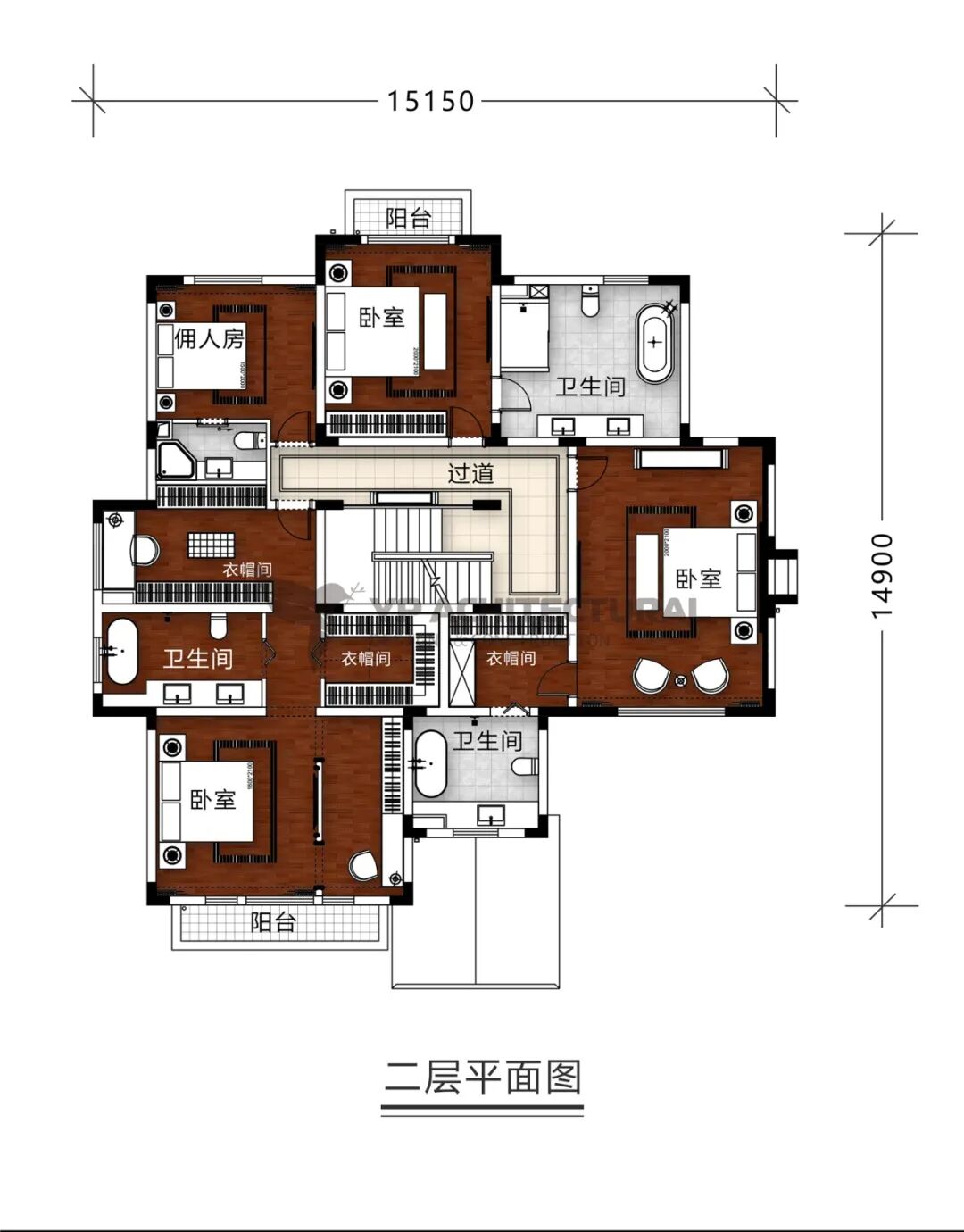 二层是龚先生夫妇及孩子的卧室,考虑到起居方便,主卧不但有超大阳台,还设有大小两个衣帽间。佣人房也贴心的安排在了二层。